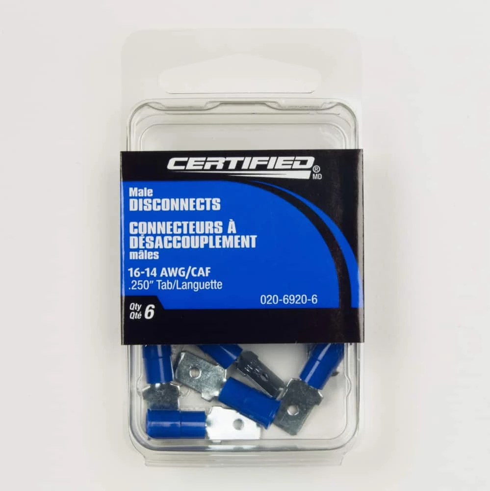 - Certified 16-14 AWG Automotive Male Quick Disconnect is used for electrical wire termination