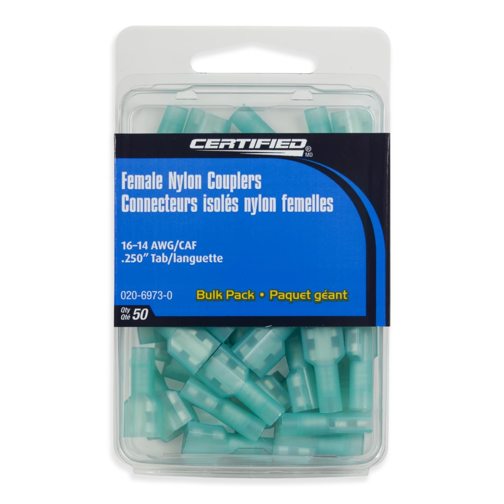 - Certified 16-14 AWG Nylon Fully Insulated Female Disconnect is used for electrical wire termination