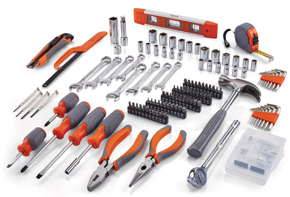 - Includes ratchets, sockets, extension, adapters, spark plug socket, hex keys, combination wrenches, bits, pliers, precision screwdrivers, saw, measuring tape, screwdrivers, hammer, level, utility knife, and fasteners