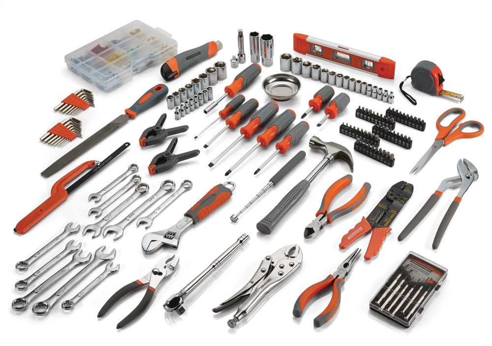 - Includes adjustable wrench, Philips precision screwdriver, long nose pliers, hardware kit, hammer, and more