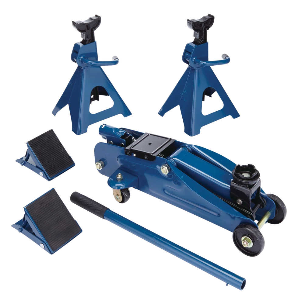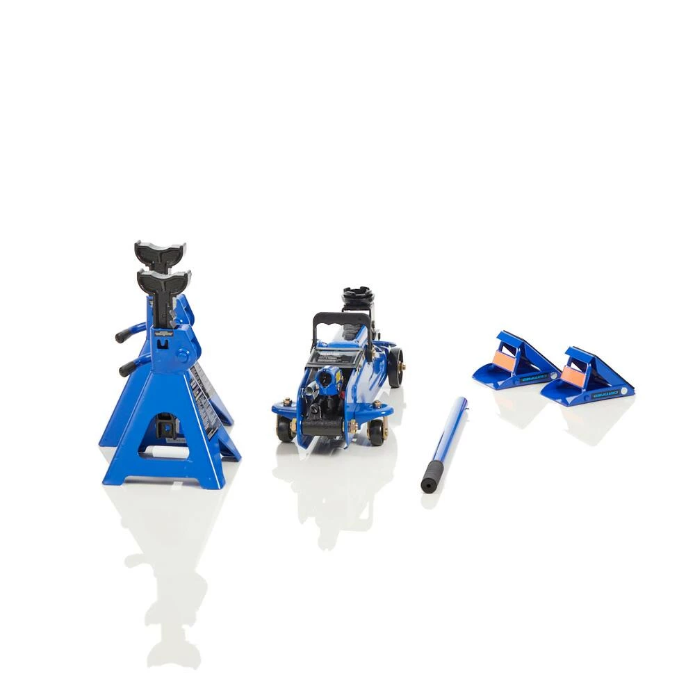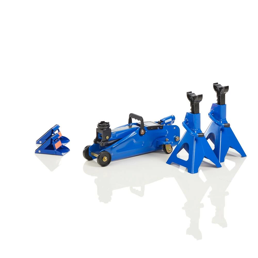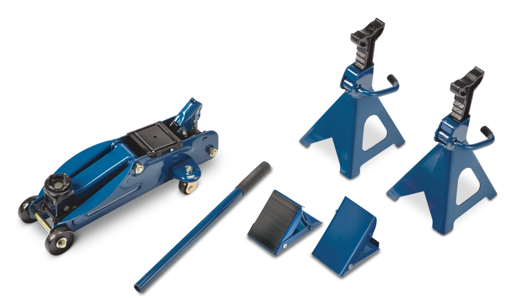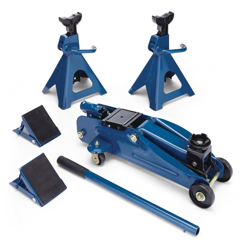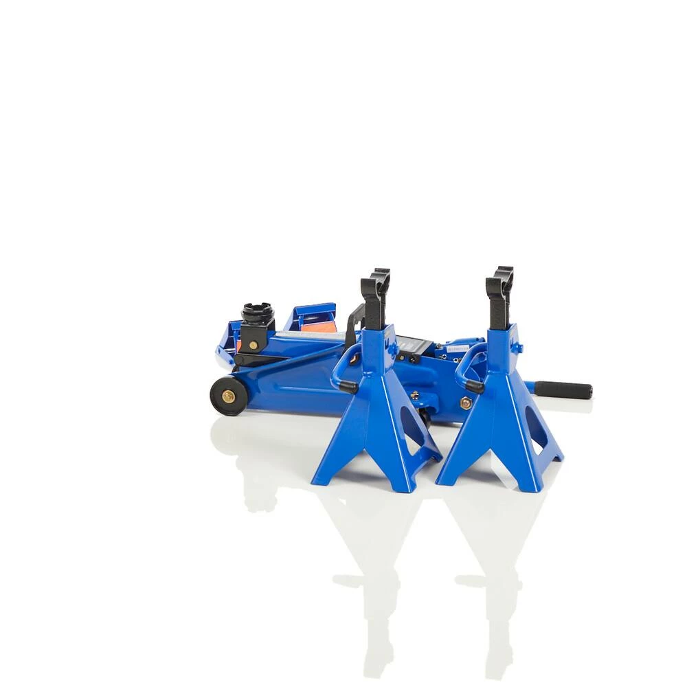 - Certified Jack and Stand Kit includes a jack, axle stands and wheel chocks