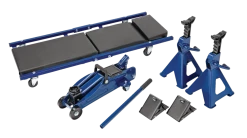 - 2-Ton Certified Jack Combo Kit includes 2-ton trolley jack, 2-ton axle stands, creeper and wheel chocks