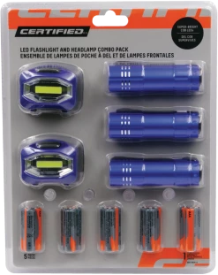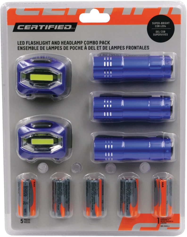 - Includes 2 headlamps, 3 flashlights, and 15 AAA batteries