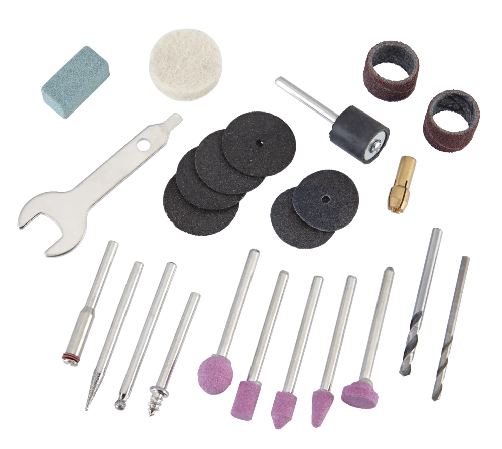 - Includes: rotary tool, 24 accessories and hex key