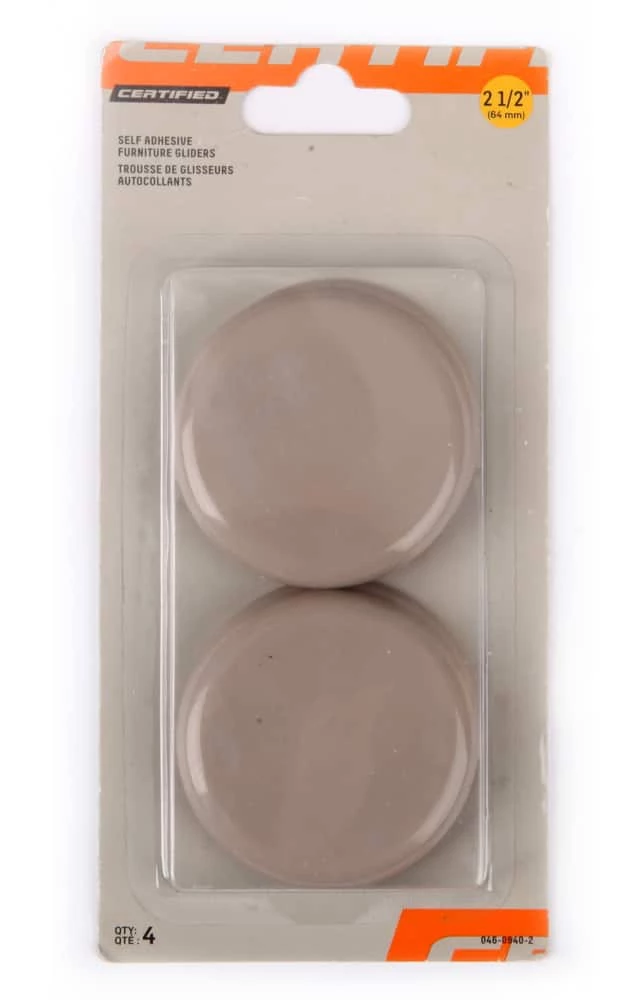 - 2-1/2″ self-adhesive furniture gliders are great on ceramic tile and carpet