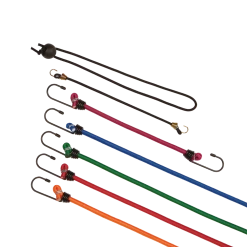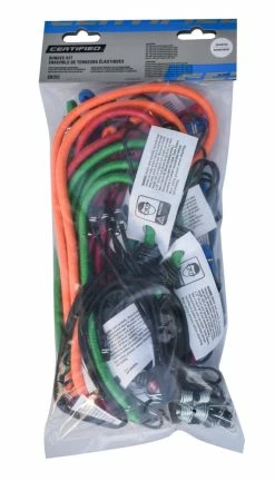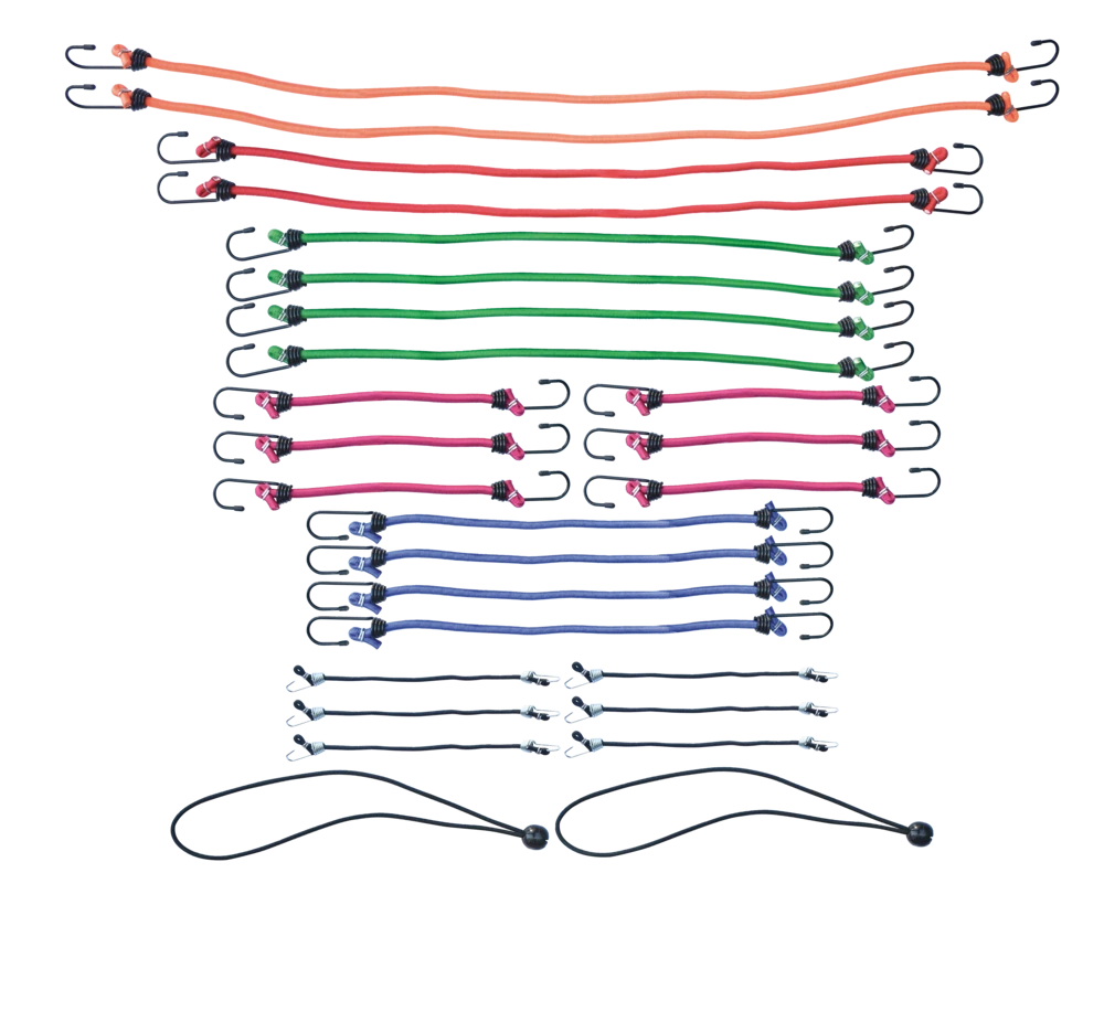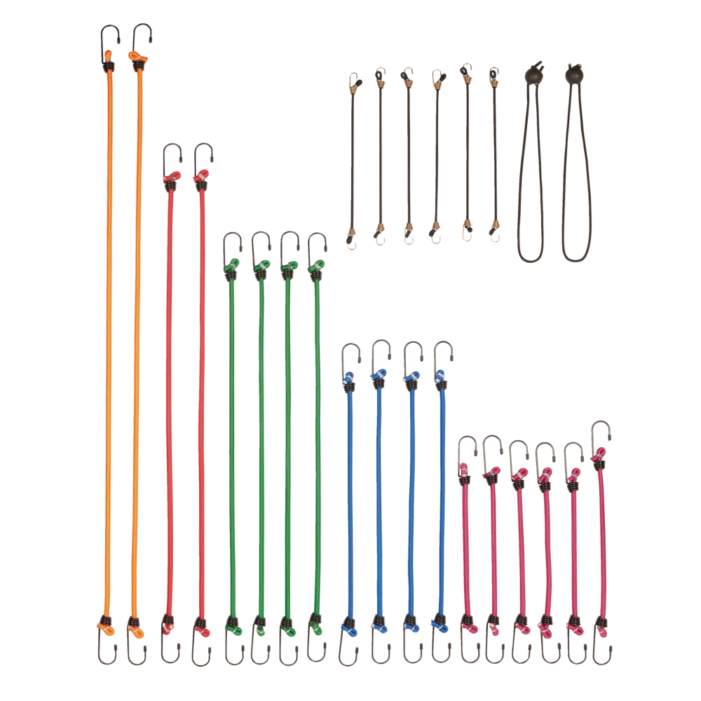- Kit includes: (6) 10″ bungees, (6) 12″ bungees, (4) 18″ bungees, (4) 24″ bungees, (2) 30″ bungees, (2) 36″ bungees and (2) toggle balls