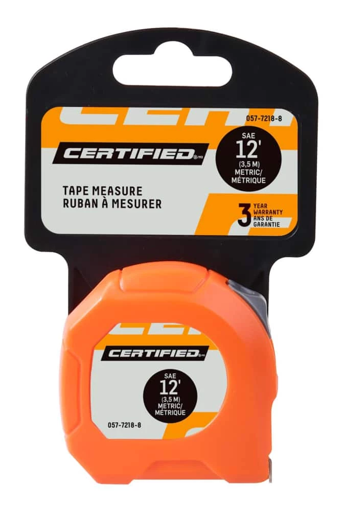 - Certified Tape Measure features a blade that displays both SAE and metric measurements